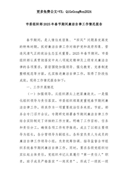 【七哥公文】2025年:市委组织部2025年春节期间廉洁自律工作情况报告+更多免费公文+VX:QiGeGongWen2024+更多免费公文+VX:QiGeGongWen2024