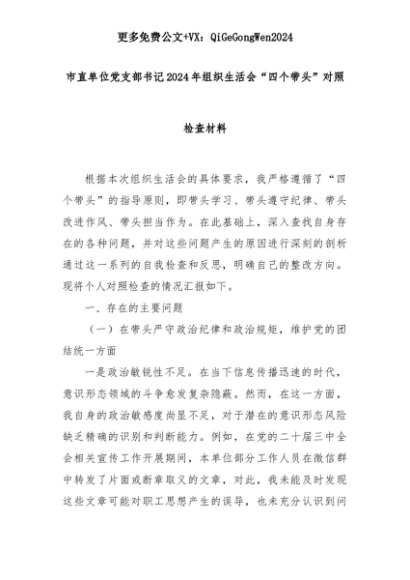 【七哥公文】2025年:市直单位党支部书记2024年组织生活会“四个带头”对照检查材料+更多免费公文+VX:QiGeGongWen2024+更多免费公文+VX:QiGeGongWen2024