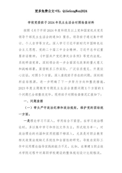 【七哥公文】2025年:学校党委班子2024年民主生活会对照检查材料+更多免费公文+VX:QiGeGongWen2024+更多免费公文+VX:QiGeGongWen2024