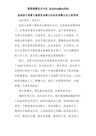 【七哥公文】2025年:在政协X县第X届委员会第X次会议闭幕大会上的讲话+更多免费公文+VX:QiGeGongWen2024+更多免费公文+VX:QiGeGongWen2024