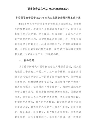 【七哥公文】2025年:市委领导班子关于2024年度民主生活会查摆问题整改方案+更多免费公文+VX:QiGeGongWen2024+更多免费公文+VX:QiGeGongWen2024