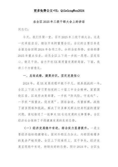 【七哥公文】2025年:在全区2025年三级干部大会上的讲话+更多免费公文+VX:QiGeGongWen2024+更多免费公文+VX:QiGeGongWen2024