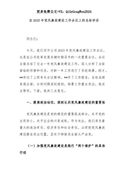 【七哥公文】2025年:在2025年党风廉政建设工作会议上的总结讲话+更多免费公文+VX:QiGeGongWen2024+更多免费公文+VX:QiGeGongWen2024