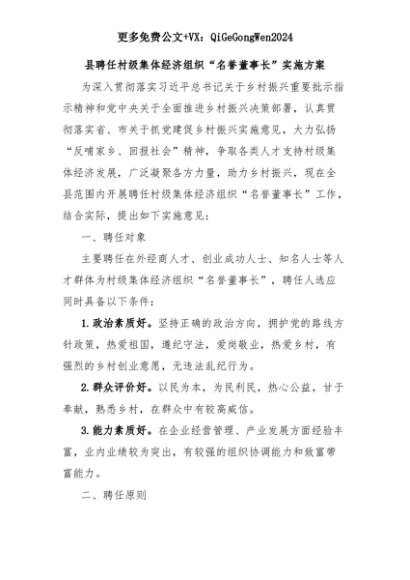 【七哥公文】2025年:县聘任村级集体经济组织“名誉董事长”实施方案+更多免费公文+VX:QiGeGongWen2024+更多免费公文+VX:QiGeGongWen2024