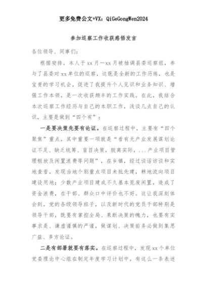【七哥公文】2025年:参加巡察工作收获感悟发言+更多免费公文+VX:QiGeGongWen2024+更多免费公文+VX:QiGeGongWen2024