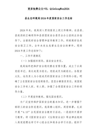 【七哥公文】2025年:县生态环境局2024年度国家安全工作总结+更多免费公文+VX:QiGeGongWen2024+更多免费公文+VX:QiGeGongWen2024