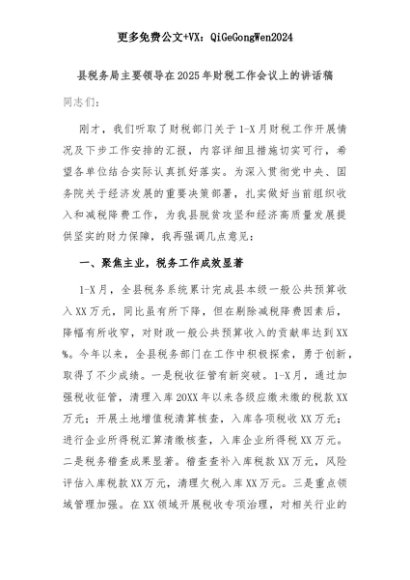 【七哥公文】2025年:县税务局主要领导在2025年财税工作会议上的讲话稿+更多免费公文+VX:QiGeGongWen2024+更多免费公文+VX:QiGeGongWen2024