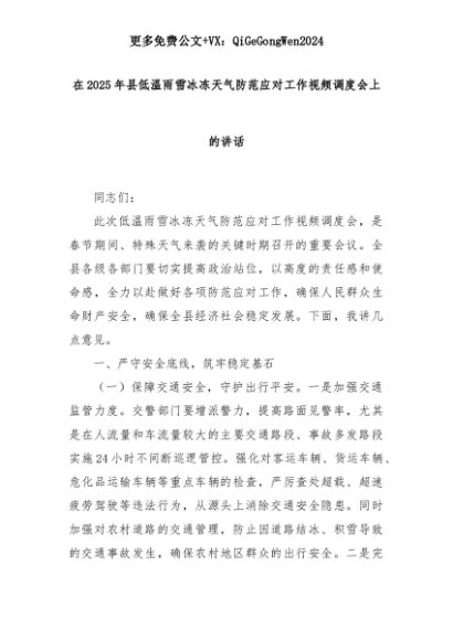 【七哥公文】2025年:在2025年县低温雨雪冰冻天气防范应对工作视频调度会上的讲话+更多免费公文+VX:QiGeGongWen2024+更多免费公文+VX:QiGeGongWen2024