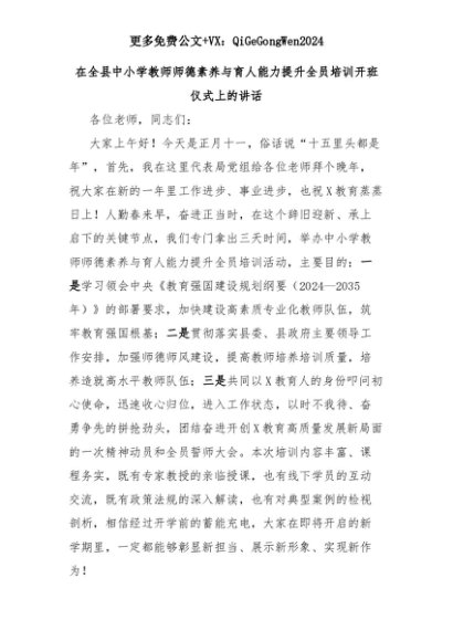 【七哥公文】2025年:在全县中小学教师师德素养与育人能力提升全员培训开班仪式上的讲话+更多免费公文+VX:QiGeGongWen2024+更多免费公文+VX:QiGeGongWen2024