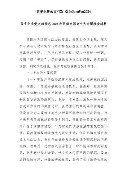 【七哥公文】2025年:国有企业党支部书记2024年组织生活会个人对照检查材料+更多免费公文+VX:QiGeGongWen2024+更多免费公文+VX:QiGeGongWen2024