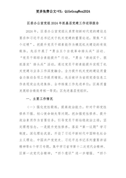 【七哥公文】2025年:区委办公室党组2024年抓基层党建工作述职报告+更多免费公文+VX:QiGeGongWen2024+更多免费公文+VX:QiGeGongWen2024
