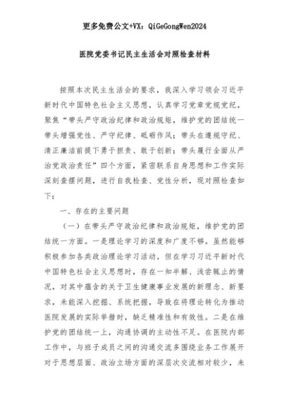 【七哥公文】2025年:医院党委书记民主生活会对照检查材料+更多免费公文+VX:QiGeGongWen2024+更多免费公文+VX:QiGeGongWen2024