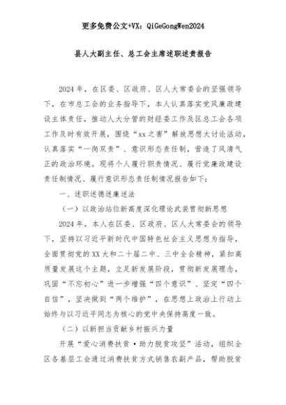 【七哥公文】2025年:县人大副主任、总工会主席述职述责报告+更多免费公文+VX:QiGeGongWen2024+更多免费公文+VX:QiGeGongWen2024
