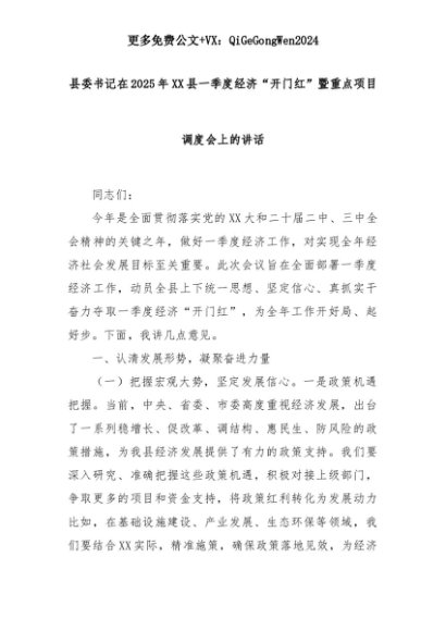 【七哥公文】2025年:县委书记在2025年XX县一季度经济“开门红”暨重点项目调度会上的讲话+更多免费公文+VX:QiGeGongWen2024+更多免费公文+VX:QiGeGongWen2024