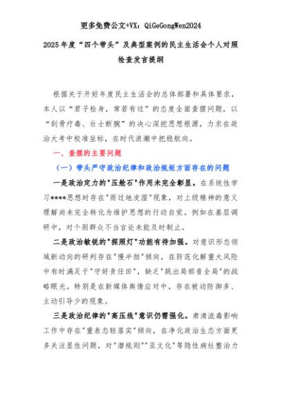 【七哥公文】2025年:2025年度“四个带头”及典型案例的民主生活会个人对照检查发言提纲+更多免费公文+VX:QiGeGongWen2024+更多免费公文+VX:QiGeGongWen2024