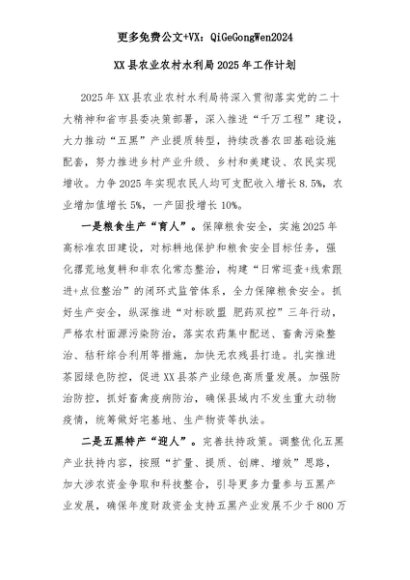【七哥公文】2025年:XX县农业农村水利局2025年工作计划+更多免费公文+VX:QiGeGongWen2024+更多免费公文+VX:QiGeGongWen2024