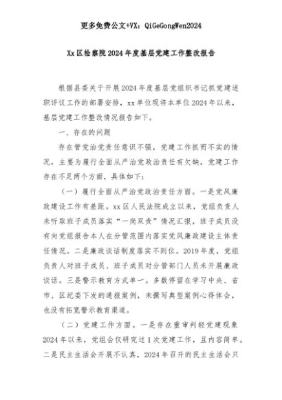 【七哥公文】2025年:Xx区检察院2024年度基层党建工作整改报告+更多免费公文+VX:QiGeGongWen2024+更多免费公文+VX:QiGeGongWen2024