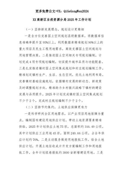 【七哥公文】2025年:XX高新区自然资源分局2025年工作计划+更多免费公文+VX:QiGeGongWen2024+更多免费公文+VX:QiGeGongWen2024
