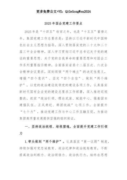 【七哥公文】2025年:2025年国企党建工作要点+更多免费公文+VX:QiGeGongWen2024+更多免费公文+VX:QiGeGongWen2024