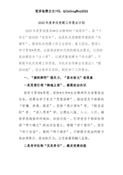 【七哥公文】2025年:2025年度单位党建工作要点计划+更多免费公文+VX:QiGeGongWen2024+更多免费公文+VX:QiGeGongWen2024