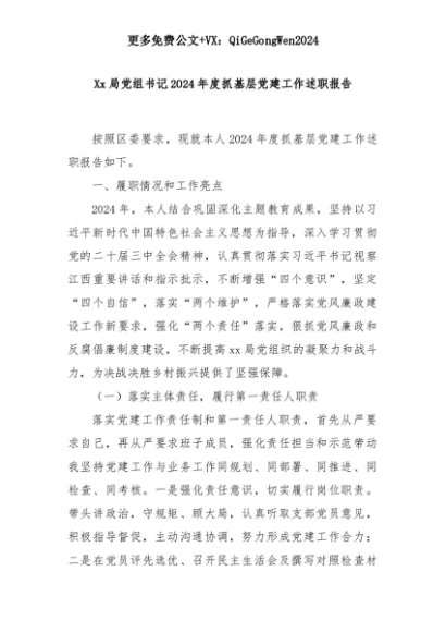【七哥公文】2025年:Xx局党组书记2024年度抓基层党建工作述职报告+更多免费公文+VX:QiGeGongWen2024+更多免费公文+VX:QiGeGongWen2024