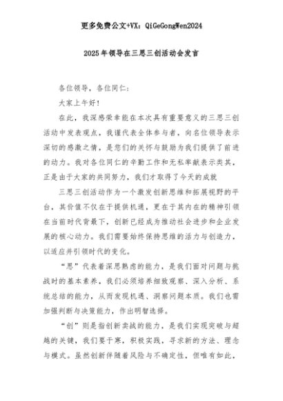 【七哥公文】2025年:(2篇)2025年领导在三思三创活动会发言+更多免费公文+VX:QiGeGongWen2024+更多免费公文+VX:QiGeGongWen2024