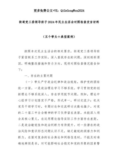 【七哥公文】2025年:街道党工委领导班子2024年民主生活会对照检查发言材料(五个带头+典型案例)+更多免费公文+VX:QiGeGongWen2024+更多免费公文+VX:QiGeGongWen2024