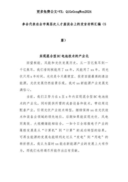 【七哥公文】2025年:(5篇)参会代表在全市高层次人才座谈会上的发言材料汇编+更多免费公文+VX:QiGeGongWen2024+更多免费公文+VX:QiGeGongWen2024