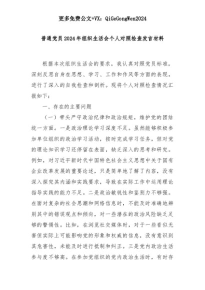 【七哥公文】2025年:普通党员2024年组织生活会个人对照检查发言材料+更多免费公文+VX:QiGeGongWen2024+更多免费公文+VX:QiGeGongWen2024