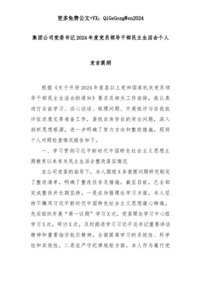 【七哥公文】2025年:集团公司党委书记2024年度党员领导干部民主生活会个人发言提纲+更多免费公文+VX:QiGeGongWen2024+更多免费公文+VX:QiGeGongWen2024
