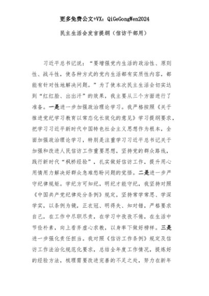 【七哥公文】2025年:民主生活会发言提纲(信访干部用)+更多免费公文+VX:QiGeGongWen2024+更多免费公文+VX:QiGeGongWen2024