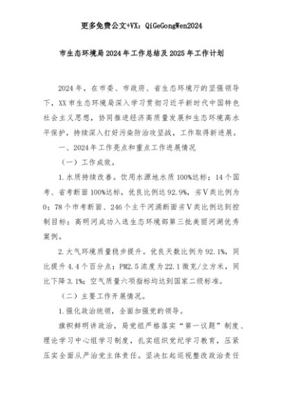 【七哥公文】2025年:市生态环境局2024年工作总结及2025年工作计划+更多免费公文+VX:QiGeGongWen2024+更多免费公文+VX:QiGeGongWen2024