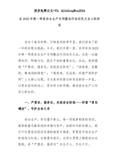 【七哥公文】2025年:在2025年第一季度安全生产专项整治行动动员大会上的讲话+更多免费公文+VX:QiGeGongWen2024+更多免费公文+VX:QiGeGongWen2024