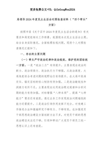 【七哥公文】2025年:局领导2024年度民主生活会对照检查材料(“四个带头”方面)+更多免费公文+VX:QiGeGongWen2024+更多免费公文+VX:QiGeGongWen2024
