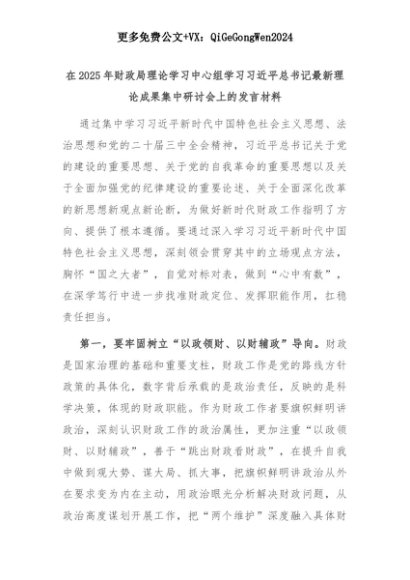 【七哥公文】2025年:在2025年财政局理论学习中心组学习习近平总书记最新理论成果集中研讨会上的发言材料+更多免费公文+VX:QiGeGongWen2024+更多免费公文+VX:QiGeGongWen2024