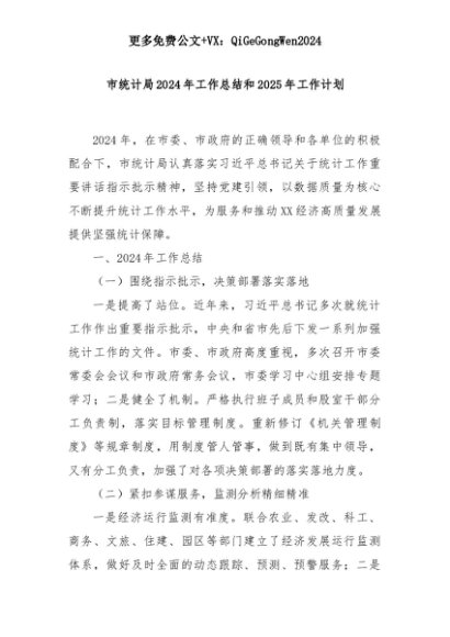 【七哥公文】2025年:市统计局2024年工作总结和2025年工作计划+更多免费公文+VX:QiGeGongWen2024+更多免费公文+VX:QiGeGongWen2024