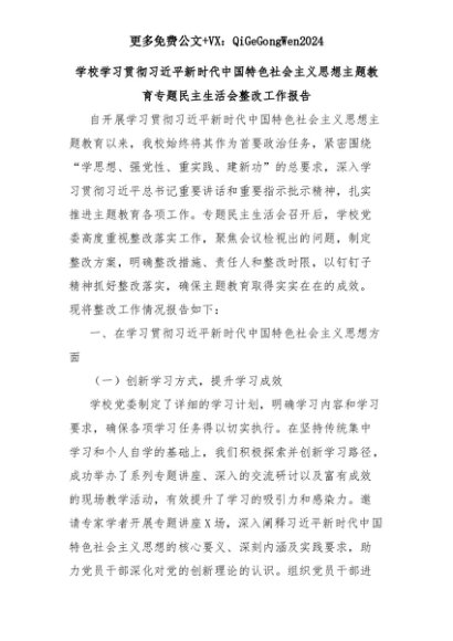 【七哥公文】2025年:学校学习贯彻习近平新时代中国特色社会主义思想主题教育专题民主生活会整改工作报告+更多免费公文+VX:QiGeGongWen2024+更多免费公文+VX:QiGeGongWen2024