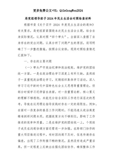 【七哥公文】2025年:局党组领导班子2024年民主生活会对照检查材料+更多免费公文+VX:QiGeGongWen2024+更多免费公文+VX:QiGeGongWen2024