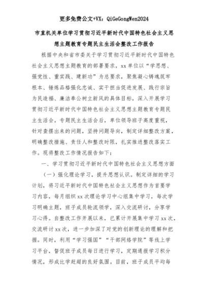 【七哥公文】2025年:市直机关单位学习贯彻习近平新时代中国特色社会主义思想主题教育专题民主生活会整改工作报告+更多免费公文+VX:QiGeGongWen2024+更多免费公文+VX:QiGeGongWen2024
