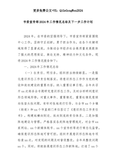 【七哥公文】2025年:市委宣传部2024年工作情况总结及下一步工作计划+更多免费公文+VX:QiGeGongWen2024+更多免费公文+VX:QiGeGongWen2024