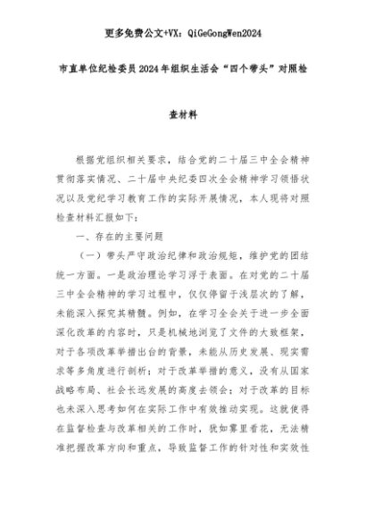 【七哥公文】2025年:市直单位纪检委员2024年组织生活会“四个带头”对照检查材料+更多免费公文+VX:QiGeGongWen2024+更多免费公文+VX:QiGeGongWen2024