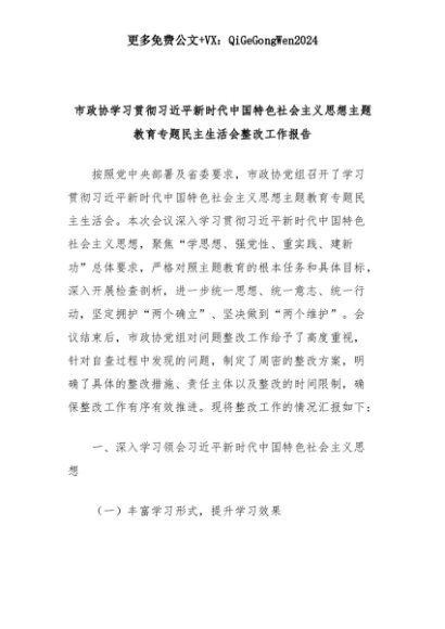 【七哥公文】2025年:市政协学习贯彻习近平新时代中国特色社会主义思想主题教育专题民主生活会整改工作报告+更多免费公文+VX:QiGeGongWen2024+更多免费公文+VX:QiGeGongWen2024