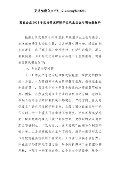 【七哥公文】2025年:国有企业2024年党支部支部班子组织生活会对照检查材料+更多免费公文+VX:QiGeGongWen2024+更多免费公文+VX:QiGeGongWen2024