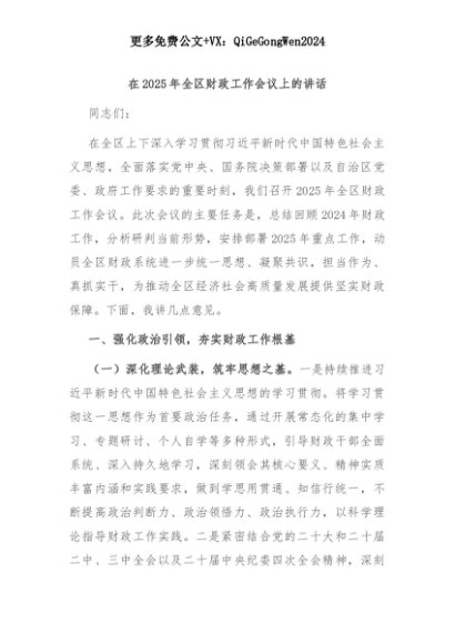 【七哥公文】2025年:在2025年全区财政工作会议上的讲话+更多免费公文+VX:QiGeGongWen2024+更多免费公文+VX:QiGeGongWen2024