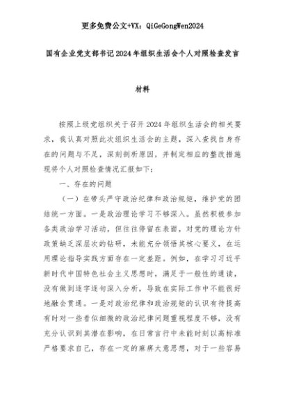 【七哥公文】2025年:国有企业党支部书记2024年组织生活会个人对照检查发言材料+更多免费公文+VX:QiGeGongWen2024+更多免费公文+VX:QiGeGongWen2024