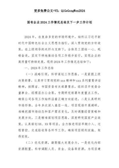 【七哥公文】2025年:国有企业2024工作情况总结及下一步工作计划+更多免费公文+VX:QiGeGongWen2024+更多免费公文+VX:QiGeGongWen2024