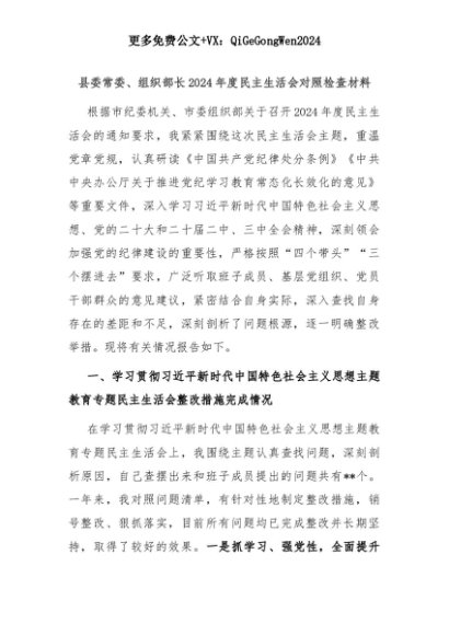 【七哥公文】2025年:县委常委、组织部长2024年度民主生活会对照检查材料+更多免费公文+VX:QiGeGongWen2024+更多免费公文+VX:QiGeGongWen2024