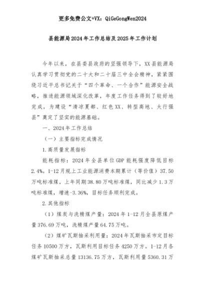 【七哥公文】2025年:县能源局2024年工作总结及2025年工作计划+更多免费公文+VX:QiGeGongWen2024+更多免费公文+VX:QiGeGongWen2024