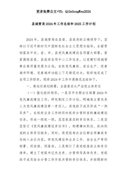 【七哥公文】2025年:县城管局2024年工作总结和2025工作计划+更多免费公文+VX:QiGeGongWen2024+更多免费公文+VX:QiGeGongWen2024
