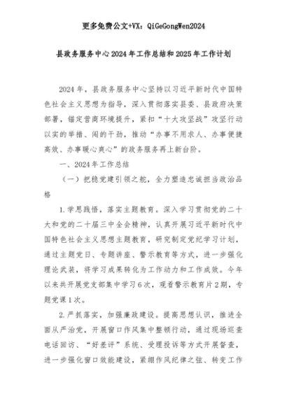 【七哥公文】2025年:县政务服务中心2024年工作总结和2025年工作计划+更多免费公文+VX:QiGeGongWen2024+更多免费公文+VX:QiGeGongWen2024